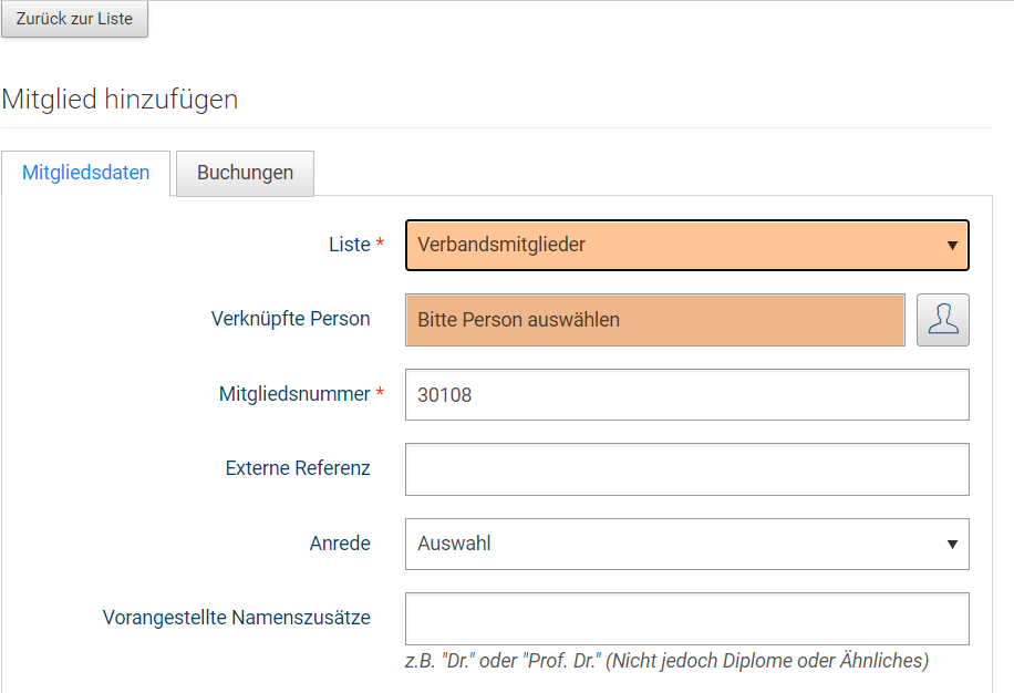 No selection is to be made in the linked person field. As soon as the member has successfully registered, a personal account is created and stored as a linked person.