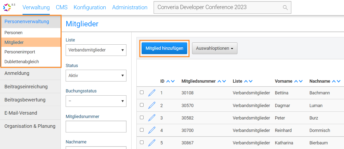 It is generally possible to assign member numbers for use in Converia only, but in this case, special care must be taken to ensure that there are no discrepancies between the member numbers and the associated (possibly already linked) personal data within an event and, in particular, within individual lists. This applies in particular when updating or reimporting lists.