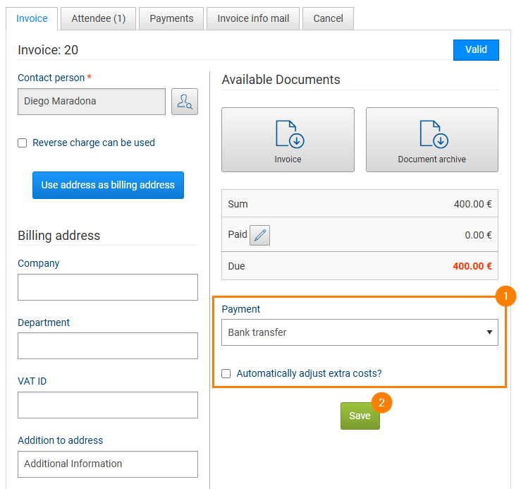 Select the desired payment method from the drop-down menu and specify whether (previously configured) additional payment costs should be calculated automatically (Fig. 1, point 1). Only payment methods activated for the event are available for selection.