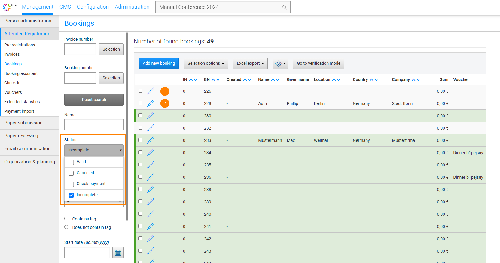 Incomplete bookings can be filtered using the Status filter in the booking overview. Incomplete bookings can quickly add up, as these are created as soon as a booking process is started - i.e. also during tests or, for example, by people who only want to look at the offers first.