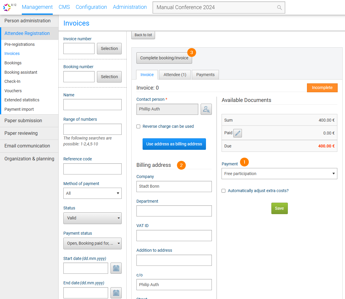 If all the details are correct, the booking can be finalized via Finalize booking/invoice (Fig. 2/3, point 3).