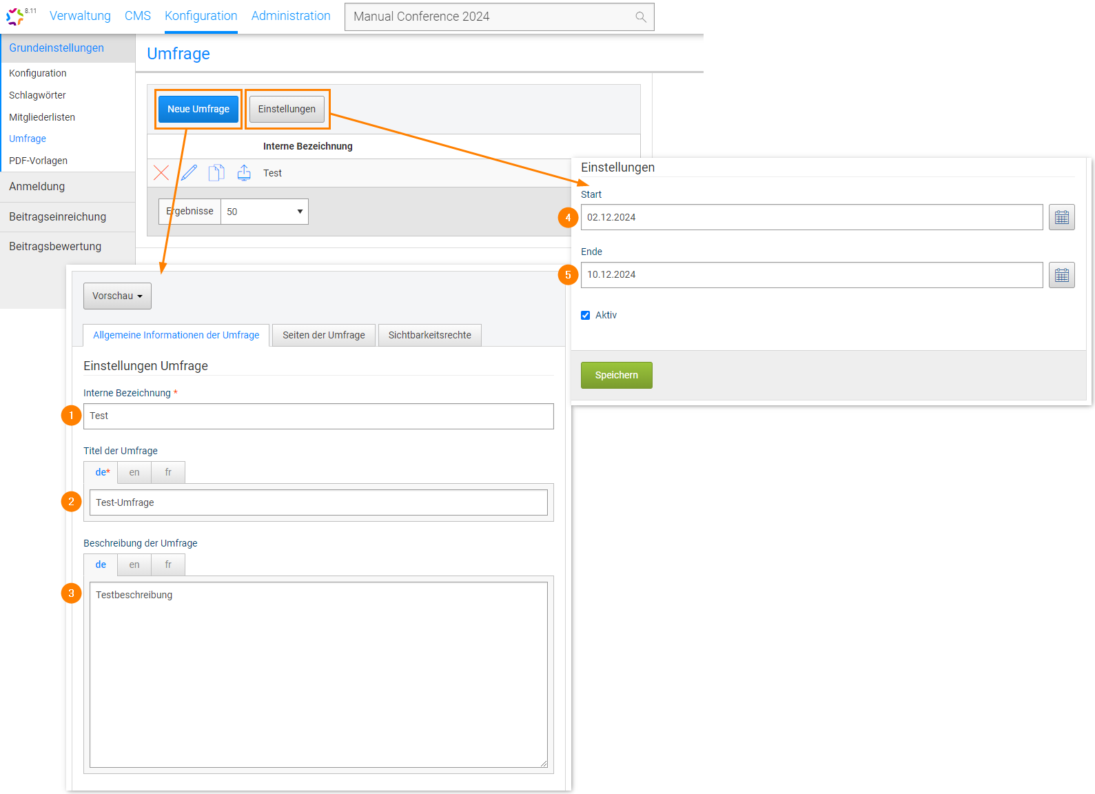 Converia allows you to create surveys, e.g. to get feedback for an event. To create a new survey, click on *New Survey*. In the settings, you can specify from when to when and whether the survey should be active.