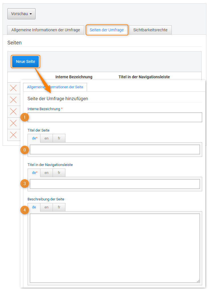 After the general information of the survey has been defined, new pages can be created and filled with content.
