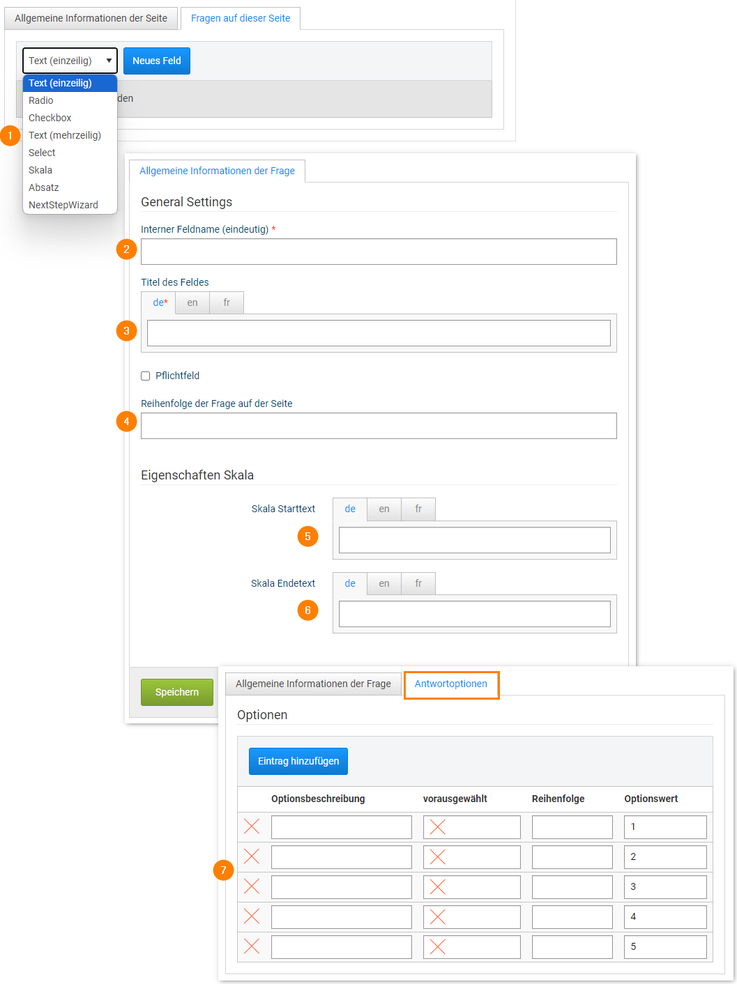 In this example, we use a five-point scale. For this scale, the ends (Fig. 3, points 5/6) of the scale can be labeled (e.g. not very good - very good). Subsequently, the individual answer options can be configured in more detail (Fig. 3, point 7). For example, you can give them different names, change the order or adjust the option values.