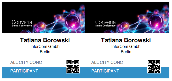 Auf dem Badge-Template bieten die Bereiche Badge-Header und Badge-Footer Platz für Grafiken, Farbbalken und einen Barcode. Die Badge-Mitte dient zur Ausgabe verschiedener Details zur Person.