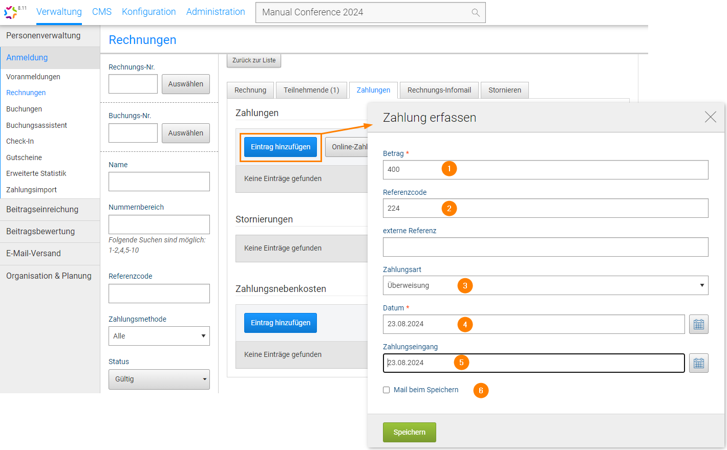 Wenn der/die Teilnehmer:in eine Zahlungsbestätigung erhalten soll, bitte Mail beim Speichern (6) anwählen. Die Mail kann vor dem Versand bearbeitet werden.